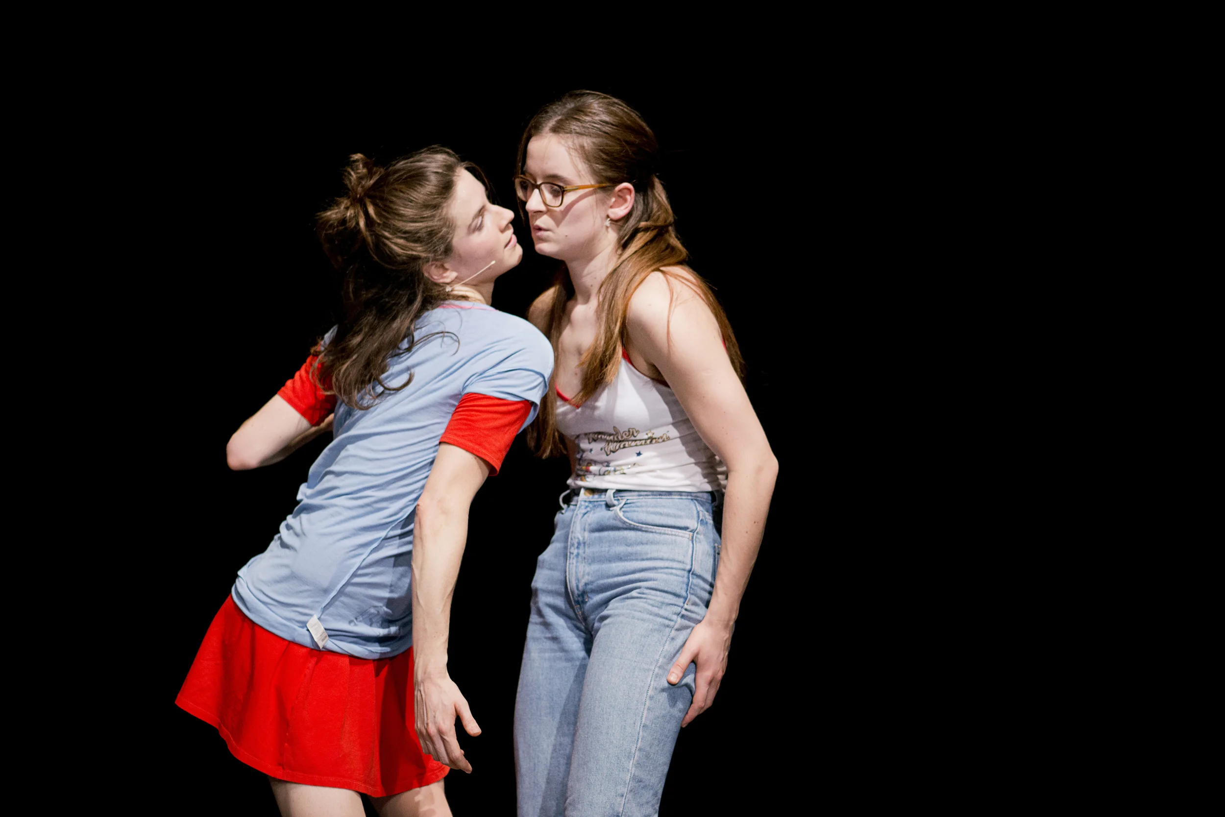 Tanguy has worked with Eleanor and Flora to develop Digging, a complex score of movement and text, creating a unique and intricate portrait of the two women and the political world they live in. They question one another, allowing their imaginations to unfold live in a transparent and playful physical conversation. Their relationship builds momentum as they dig into their bodies and voices, conjuring a series of absurd scenes and characters.